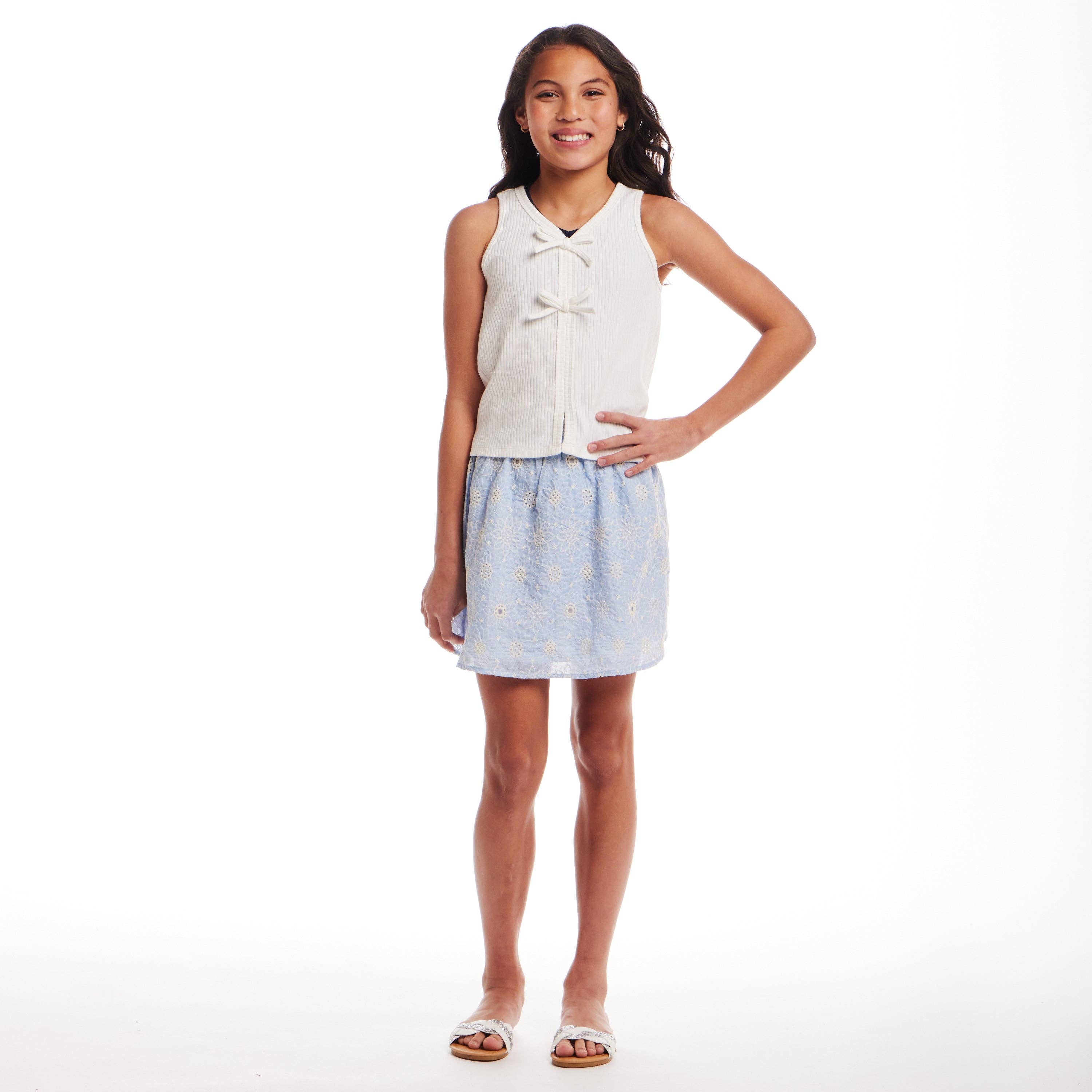 Classic and charming, this two-piece set combines effortless elegance with everyday comfort. The delicate bow details on the top and the embroidered eyelet skirt create a look that is perfect for playdates or special outings. Sweet, stylish, and oh-so-comfy!