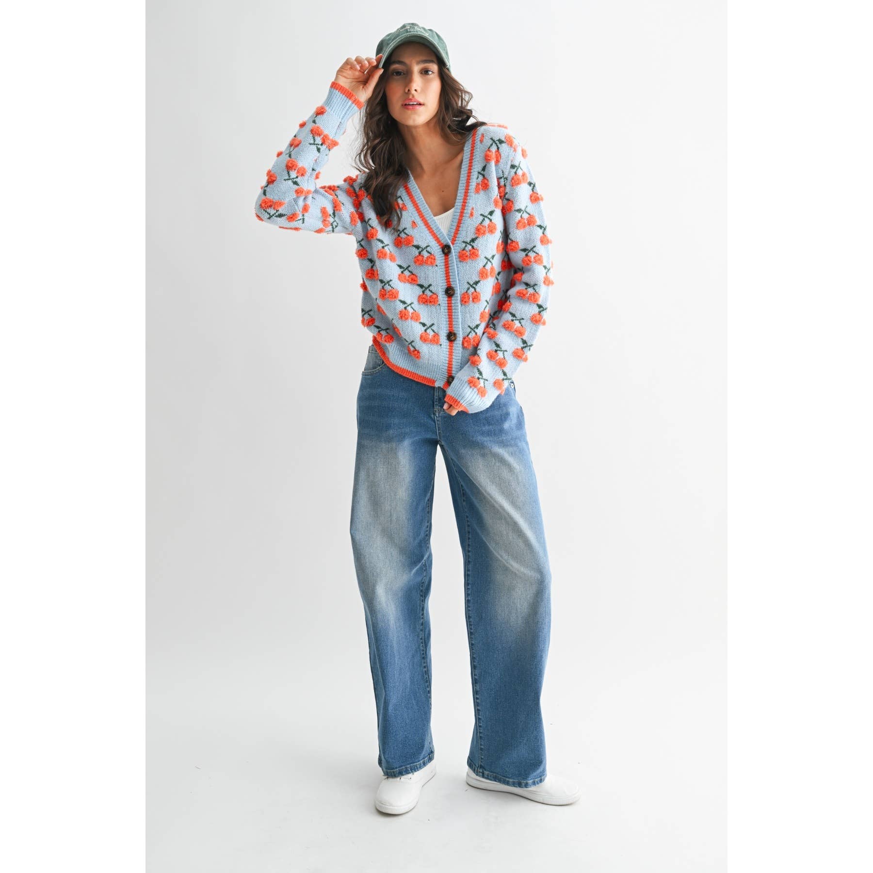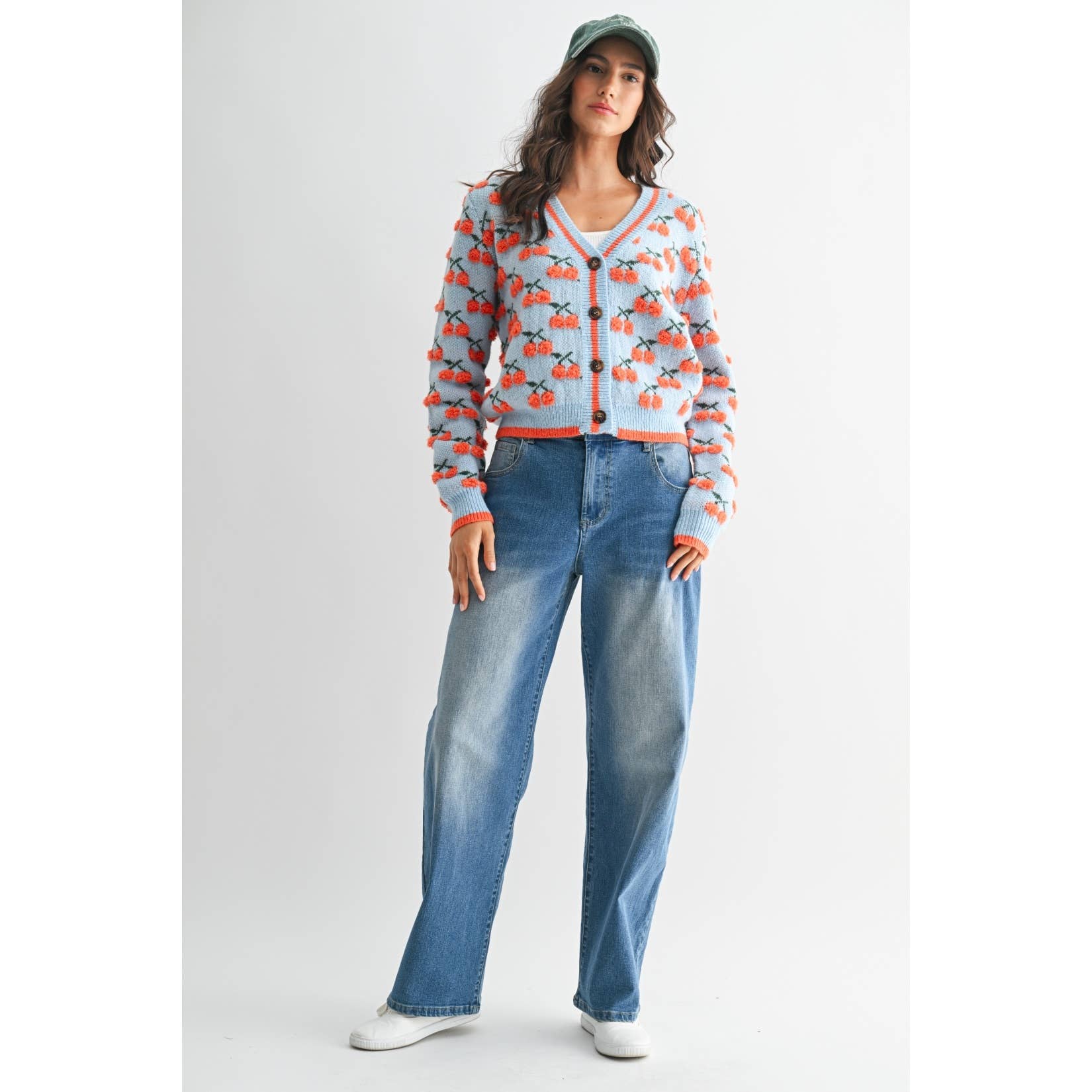 This Cherry Knit Cardigan provides a blend of style and comfort. The vibrant cherry pattern set against a soft blue knit adds a playful touch to any outfit, making it a versatile piece for your wardrobe.