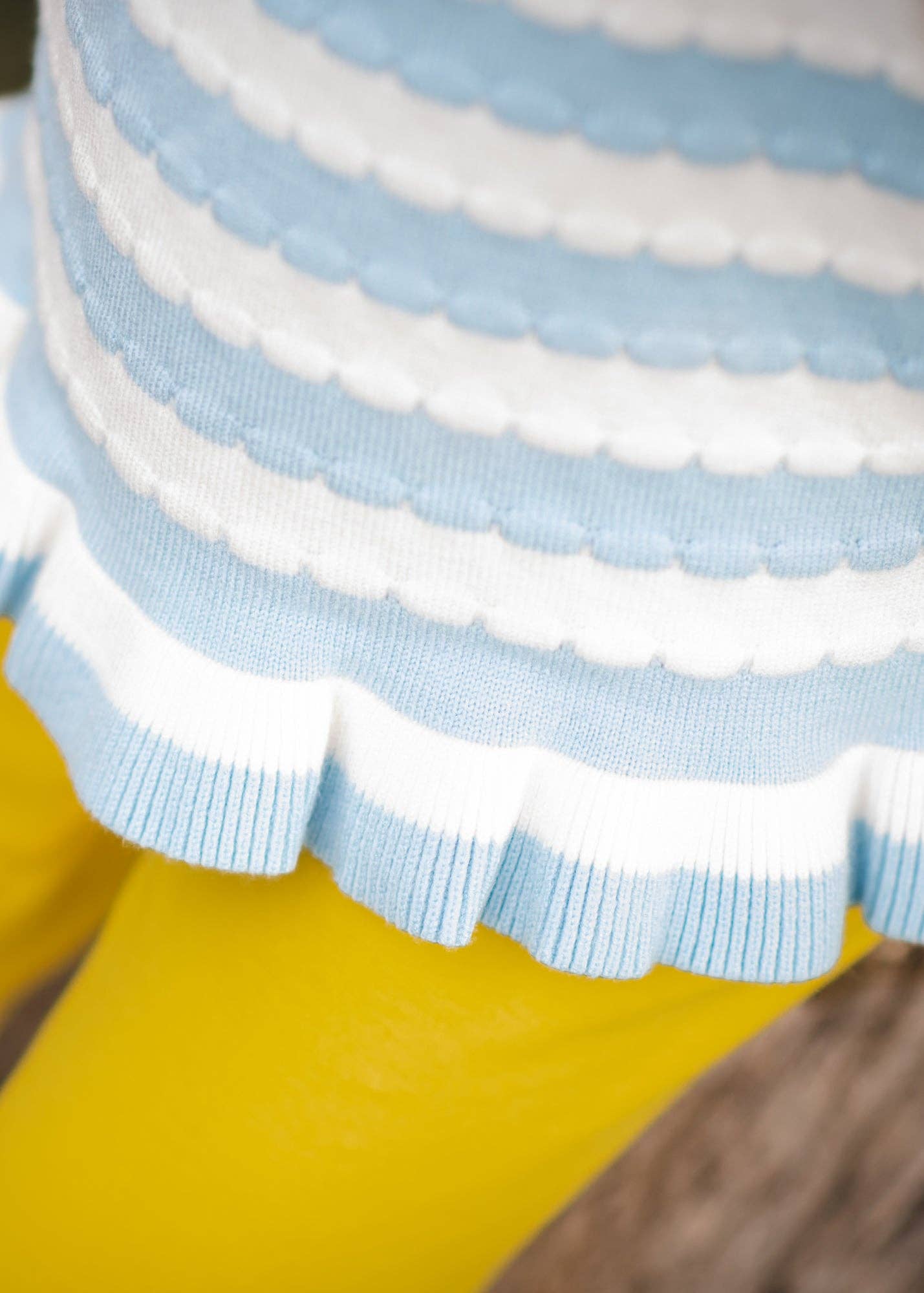 A sophisticated silhouette meets classic baby blue all wrapped up in the softest yarns around. The Blue Skies Sweater Tank strikes a delicate balance of detail and simplicity in contrasting scalloped stripes and ruffled ribbed hems.