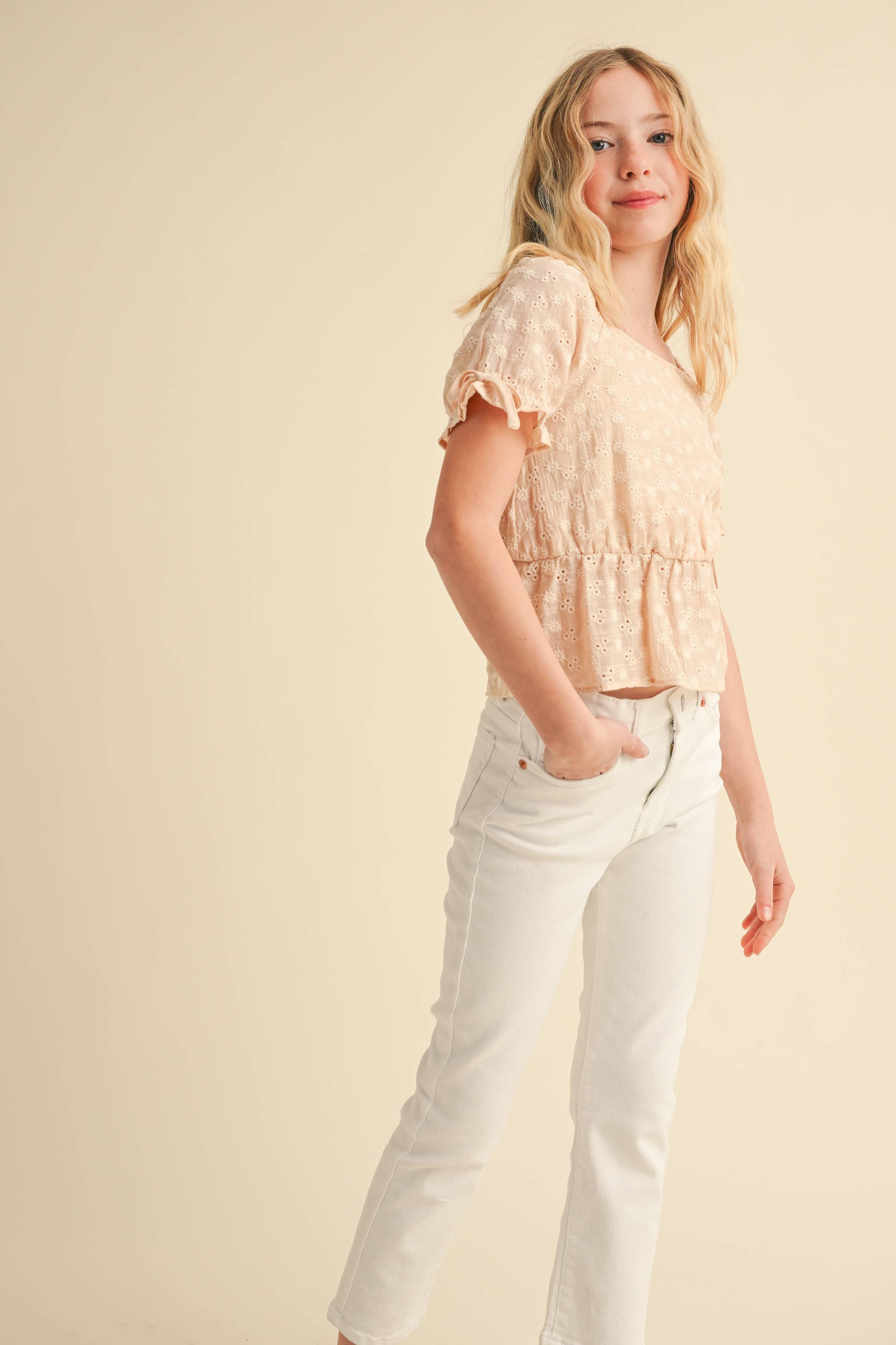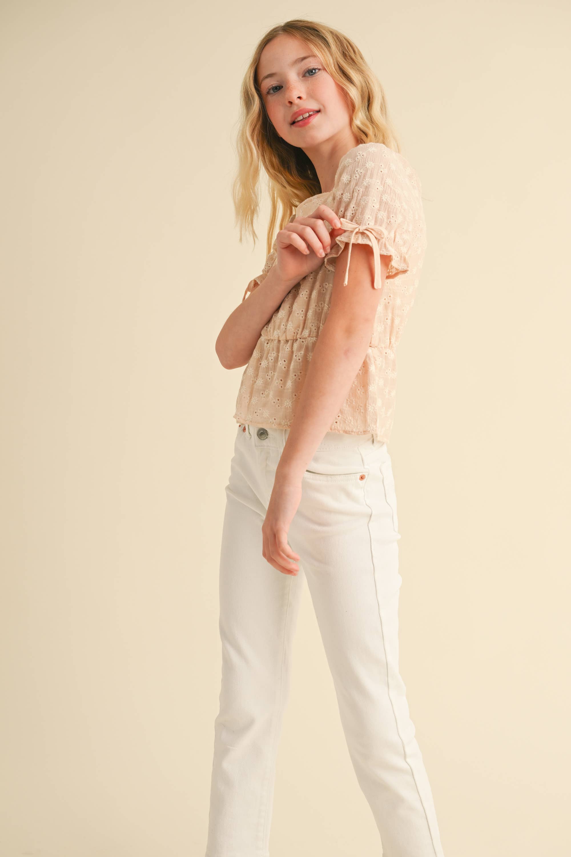 This short sleeves woven top is made from an intricate ditsy floral embroidered cotton fabric in a pretty beige color and lined with a cooling cotton fabric for comfort. The square neck adds a contemporary touch to the sweet peplum and bows making this truly the perfect top for both dress up and dress down occasions for your tween girl.