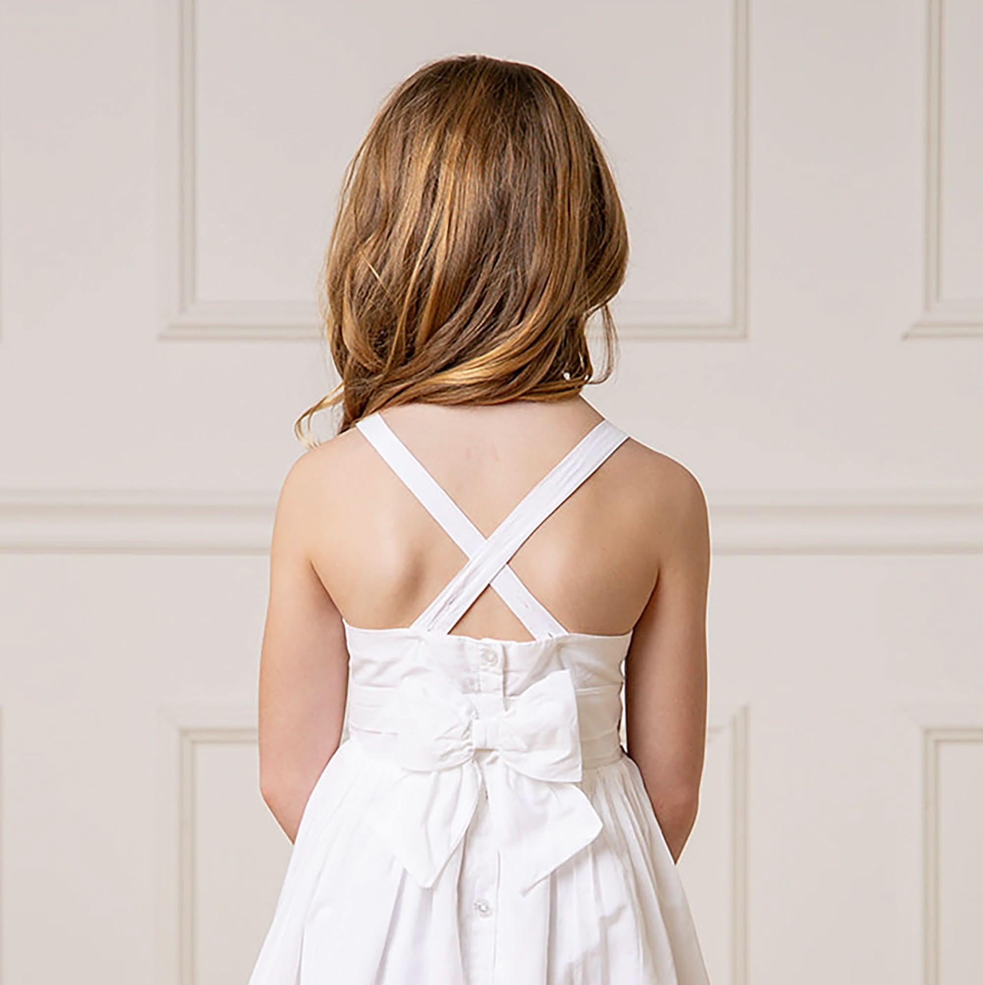 Our elegant special occasion dress in soft organic cotton has all the incredible details that make it perfect for everything from dinner with the family to twirling on a dance floor. Features beautiful embroidered hem details, ruffled cuffs, pintucked bodice, and button closure with bow at the back. Fully lined in organic cotton. A showstopper!
