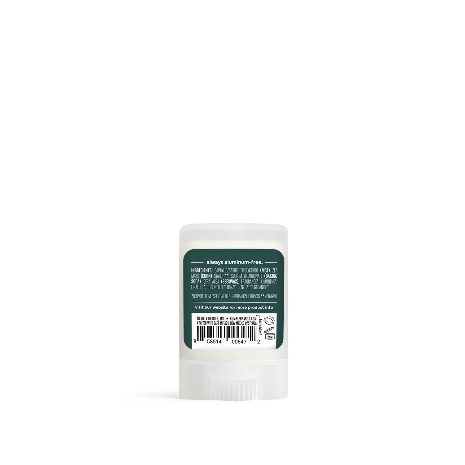 Product Description: Made with simple, highly effective ingredients (MCT oil, non-GMO corn starch, beeswax, baking soda and botanically-based scents). Humble Brands Deodorant is formulated to absorb and neutralize body odor. Humble Brands Deodorant has no aluminum, alcohol, dyes, parabens, sulfates or artificial fragrance. Certified Cruelty-Free by Leaping Bunny and a 1% for the Planet product that gives back with every purchase. Full size deodorant containers are made from 75% post consumer recycled plastic.