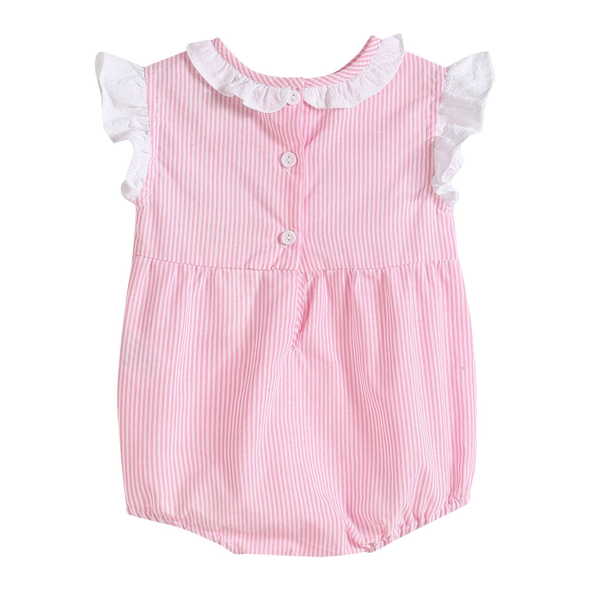 Your tiny darling will be so sweet in this pink-striped romper. This adorable romper has smocking detailed with pretty Lil Sister embroidery. Also features ruffles at the neckline and cute flutter sleeves. Buttons along the back allow it to slip easily over their head and snaps on the crotch allow for easy diaper changes.