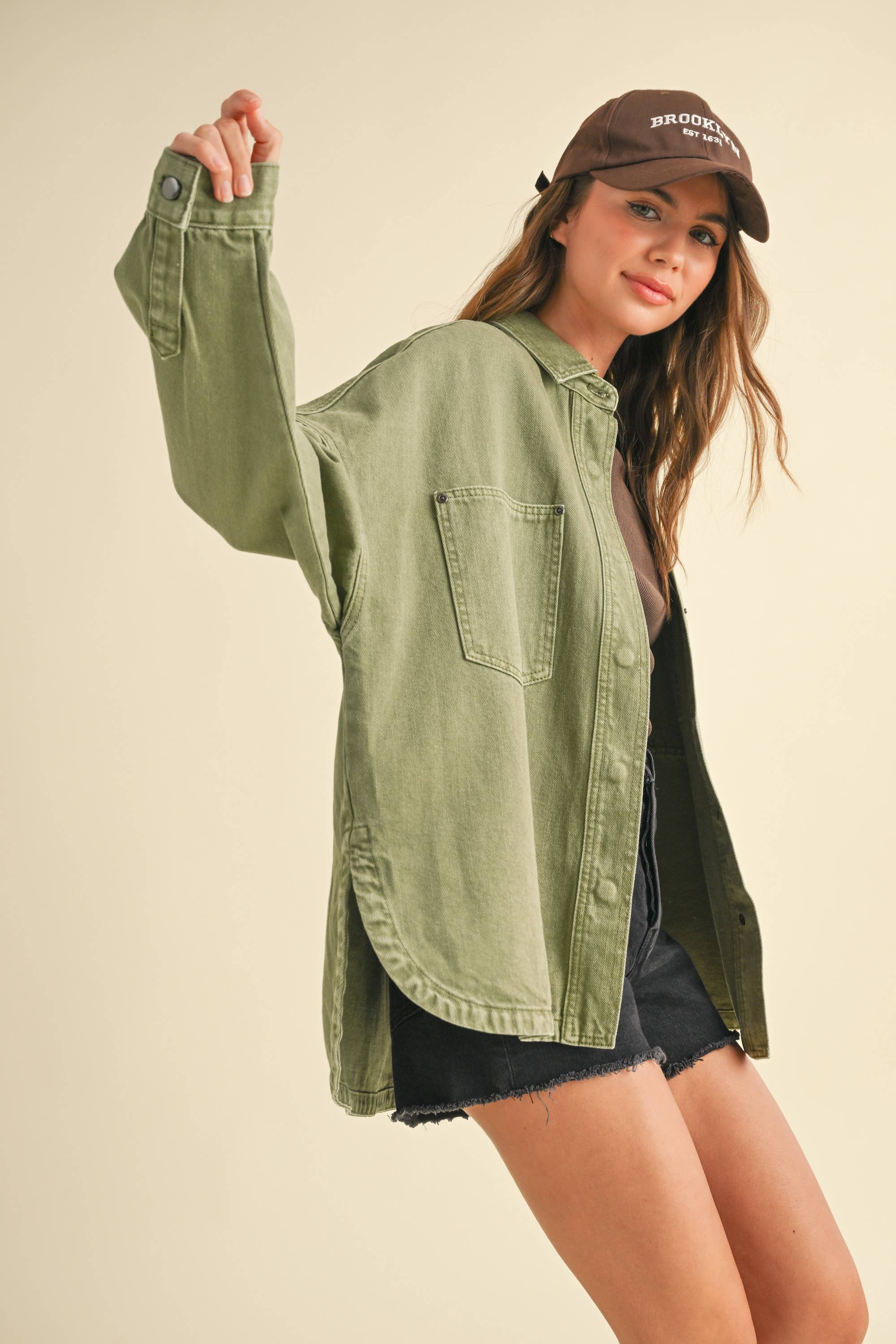MIOU MUSE - J5364 WASHED SNAP BUTTON DENIM SHACKET: OLIVE