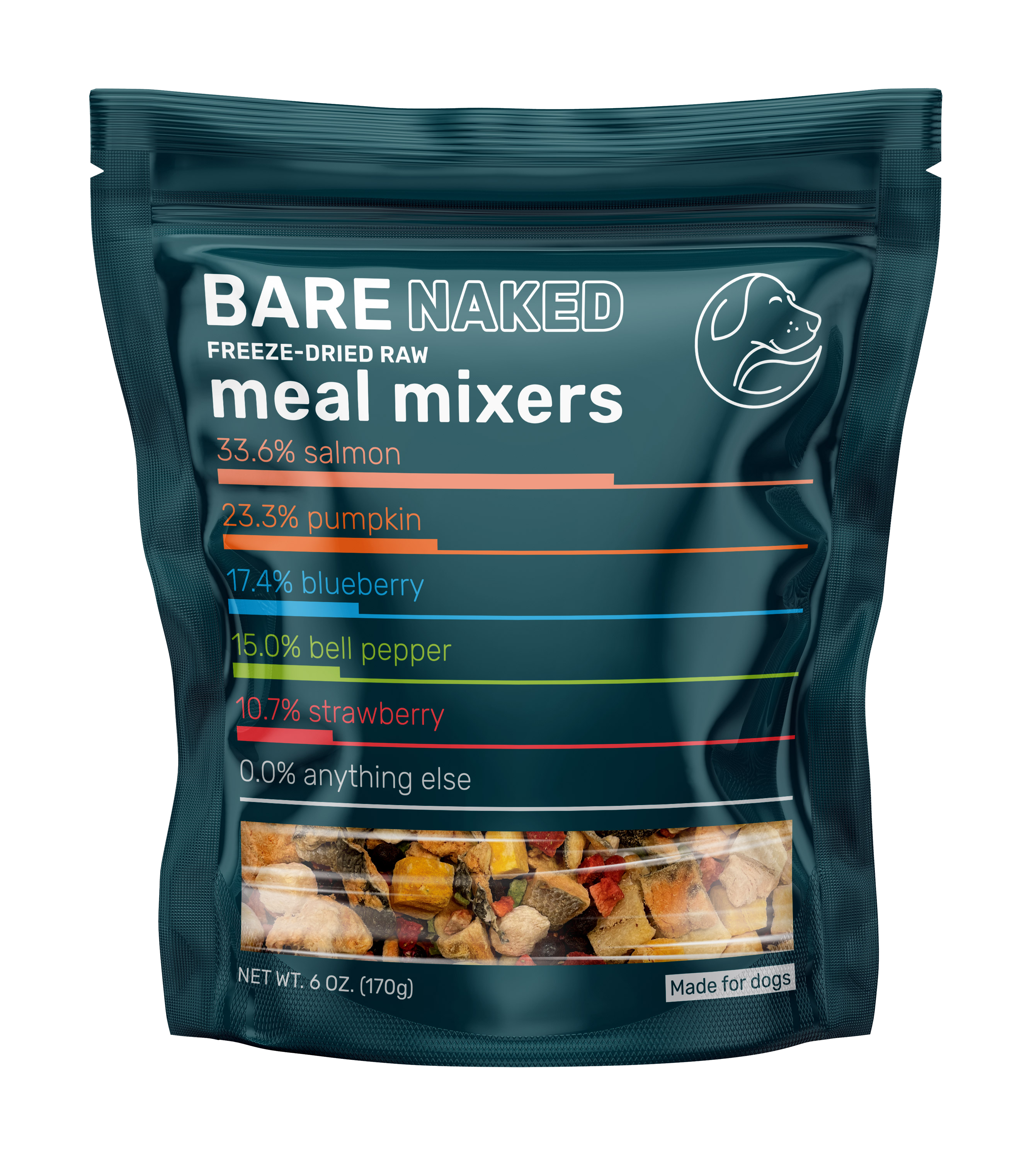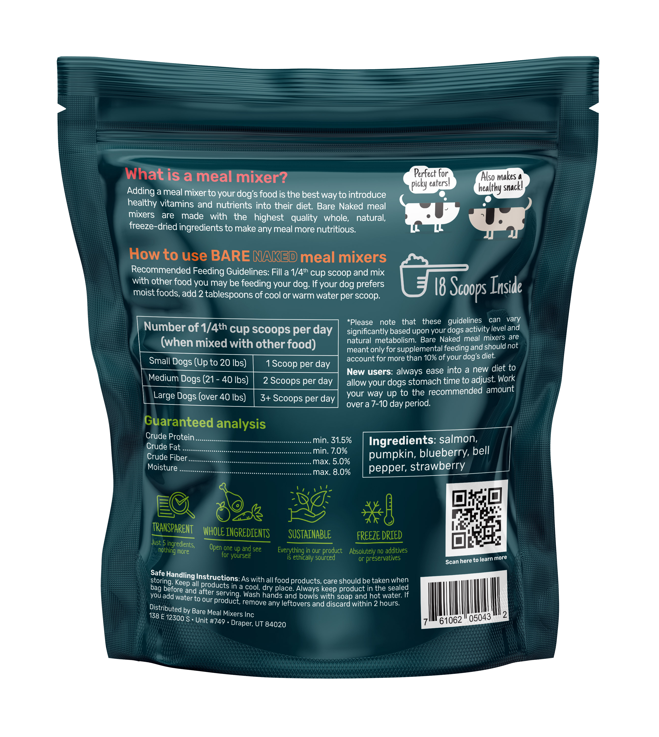 Mix into your dog's daily meals, use for the tastiest lick mats, or use as a healthy snack! Contains just 5 ingredients, nothing else. Freeze-dried raw protein, vegetables, & fruits bringing a punch of flavor & nutrients to every occasion. This fishy mix is rapidly becoming a crowd favorite. It's made with wild-caught pacific sockeye salmon. Bare is great for picky eaters!